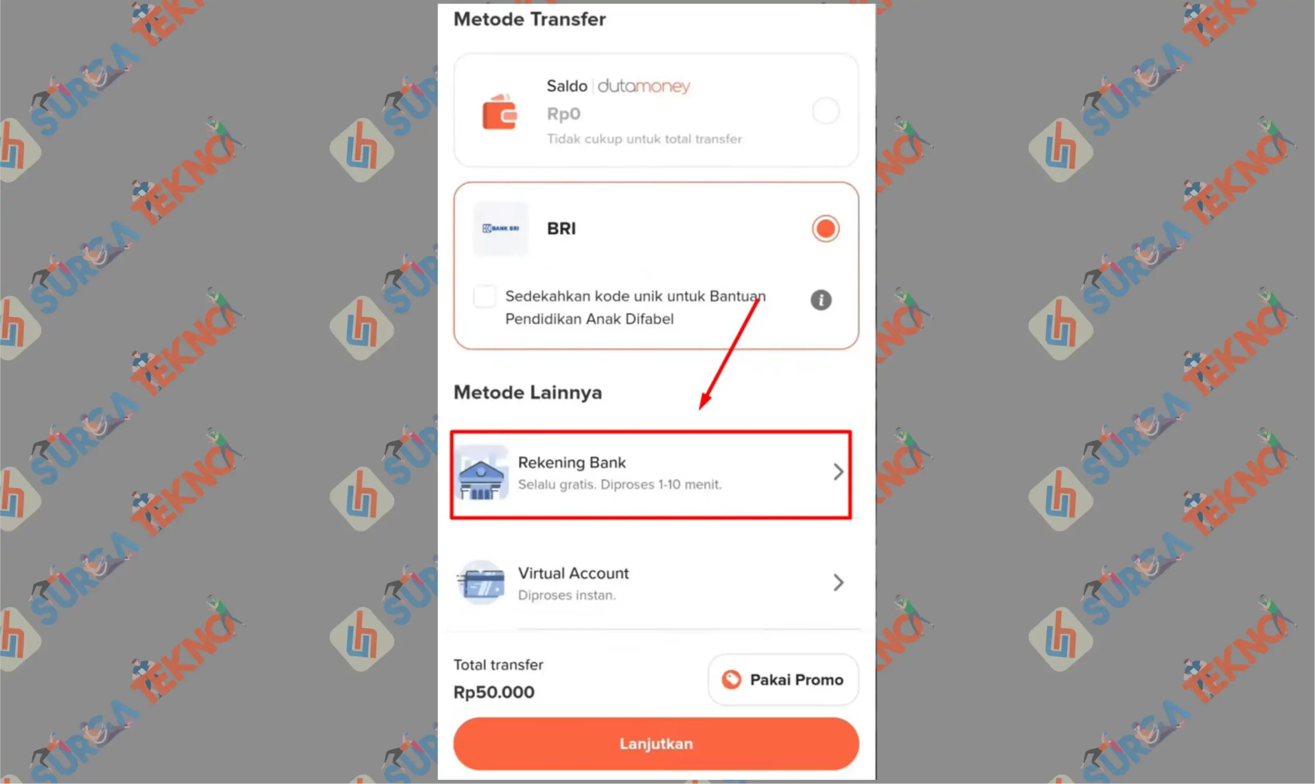 - Scroll ke bawah sampai di bagian Metode Lainnya, tersedia transaksi Rekening Bank atau VA Bank. Pilih salah satu.