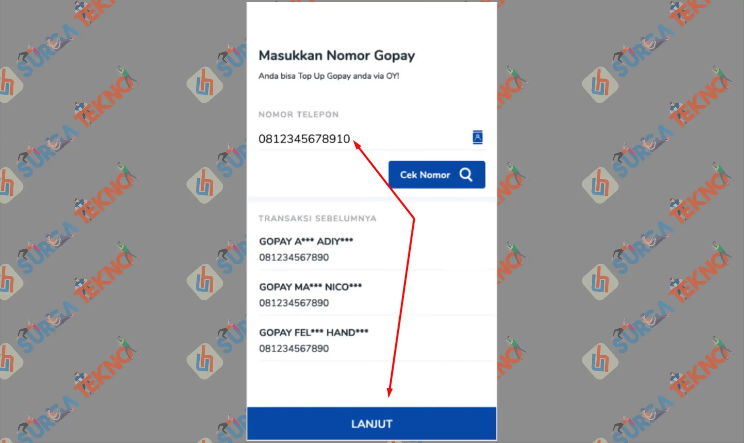 - Kemudian masukkan nomor akun Gopay milikmu. Kalau sudah ketuk tombol Lanjut.