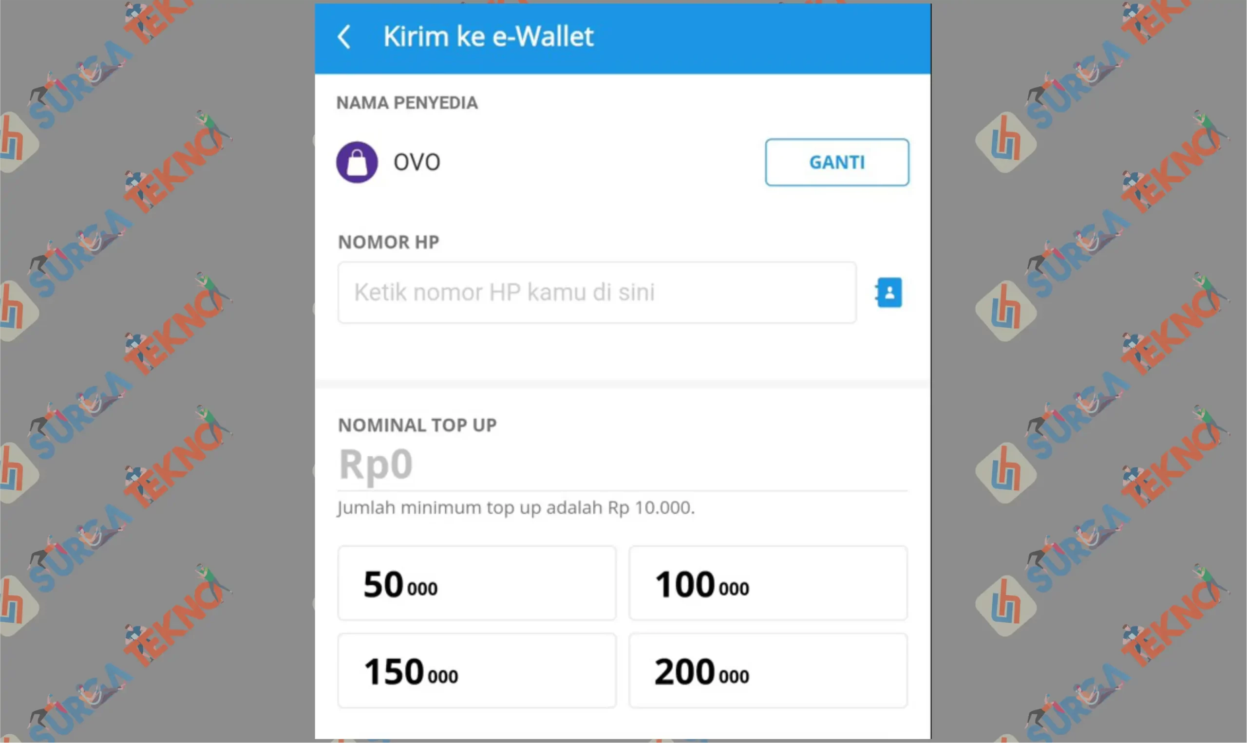- Tersedia beberapa platform dompet digital, di sini kami contohkan isi uang ke akun OVO.
