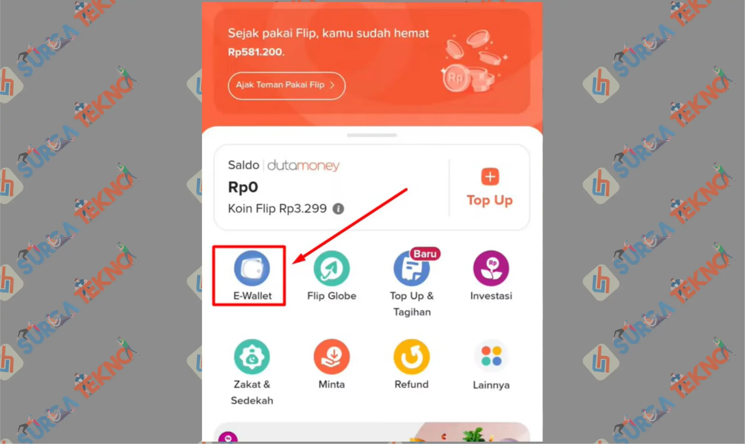 - Di tampilan awal menu Flip, ketuk saja tombol E-Wallet.